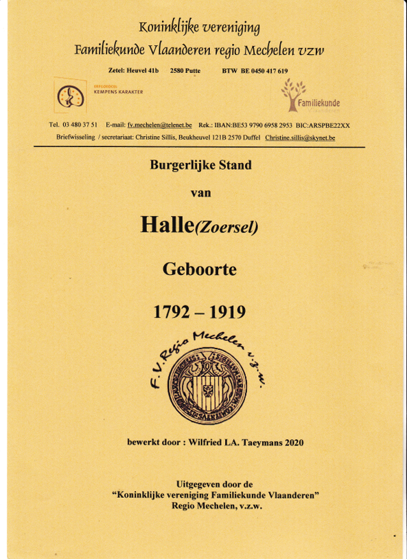 Deze gezinsreconstructie bevat de gegevens van de Burgerlijke Stand van de gemeente Halle (Kempen) voor de periode 1792 tot 1919. Van de periode 1792 tot 1802 bestaat enkel nog een alfabetische index (aangeduid met de letters KL), maar die overlappen wel de akten uit de parochieregisters (PR). Er werd gebruik gemaakt van de scans van de registers van het Rijksarchief of deze van Familysearch. In een poging om zoveel mogelijk informatie te verstrekken, werden ook de gemeenten van de provincie Antwerpen nagekeken en de relevante gegevens genoteerd. Alles wat bij de geboorten in cursief vermeld staat is bijkomende informatie. De vermelde overlijdens werden vooral ontleend aan de gegevens van bidprentjes en grafzerken . Het getal voor de boreling duidt op het nummer van de akte. Bij de zoektocht naar de overlijdensplaatsen en –data werd gebruik gemaakt van het bestand van Frans Schelfhout(+), de gegevens van Peter Van Looveren en gegevens van de bidprentjes van Ludo Jacops, de Heemkringen van Schilde (Scilla) en Zoersel. Ook werd er gekeken op Geneanet en gegevens die er konden gecontroleerd worden, werden ook nagelezen. De gezinnen werden alfabetisch gerangschikt volgens de stamvorm van de naam. Er werd geen rekening gehouden met de voorvoegsels zoals : Van, Van de(r), Ver-, De, enz. Soms werd de alfabetische volgorde binnen een familienaam niet gerespecteerd omwille van een betere bladschikking en om de gezinnen zoveel mogelijk volledig weer te geven. Wilfried Taeymans